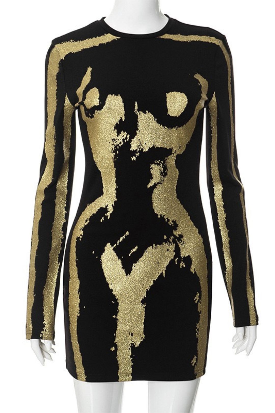 Name: Casual Printed Gold Round Neck Long-sleeved Slim Short Dress Categories: MINI DRESS