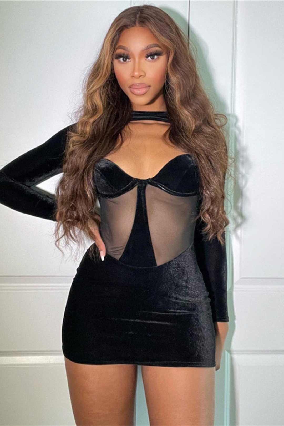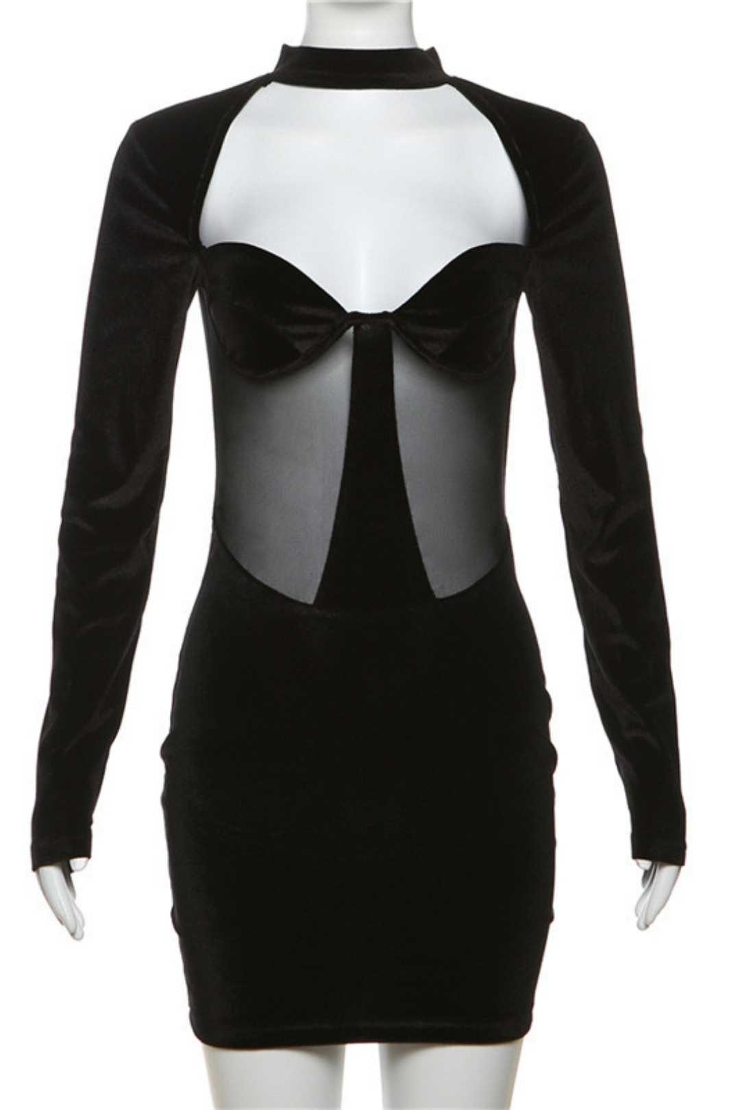 Name: Hollow Round Neck Long-sleeved See-through Mesh Dress Categories: MINI DRESS